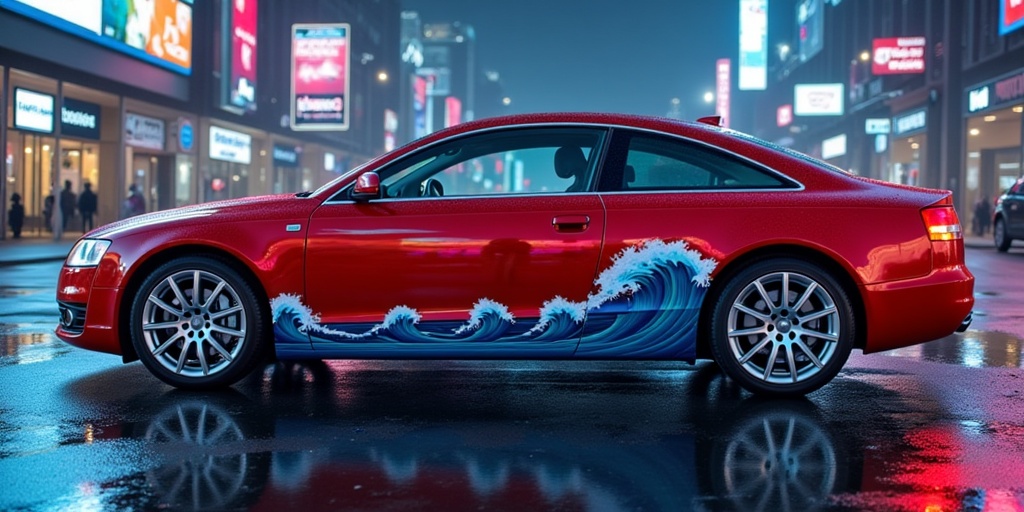 The red color was chosen for its boldness and universal appeal; it conveys energy and passion, qualities that align with a sporty, premium vehicle aesthetic. The gloss finish complements this choice, adding depth to the color and enhancing reflections. Adding black tiger stripes brings a dynamic and wild essence that merges elegance with aggression, making the vehicle highly unique. The absence of decals keeps the design clean and focused on the pattern, which is prominent enough to make a statement on its own. The urban cityscape setting amplifies the modern and eye-catching nature of the design.